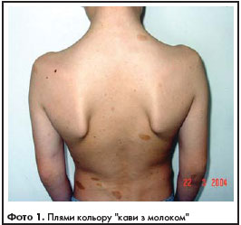 1. не менше п'яти плям кольору "кави з молоком" діаметром більше 5 мм у дітей препубертатного віку і не менше шести таких плям діаметром більше 15 мм в постпубертатному віці;