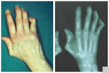 • формирование ревматоидноподобной кисти за счет изменений в периартикулярных тканях; эрозии суставных поверхностей нехарактерны (могут быть лишь у 5% больных);