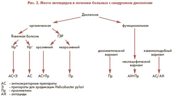 и только в случае ее недостаточной эффективности (при язвенноподобном варианте диспепсии) назначают дополнительно ингибиторы протонной помпы (рис. 2). Кроме того, антациды способствуют нормализации открытия привратника, эвакуации химуса из желудка, снижению интрагастрального и интрадуоденального давления.
