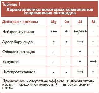 алюминия хорошо нейтрализует соляную кислоту, эффективно связывает желчные кислоты, обладает высокой цитопротективной способностью, не влияет на газообразование. В то же время этот компонент действует достаточно медленно и способствует