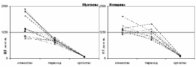 У мужчин во время перехода среднее значение и дисперсия VLF выше. В клиностазе и ортостазе значение и дисперсия VLF сопоставимы у обоих полов.