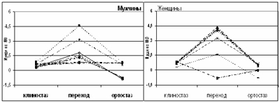 У мужчин в клиностазе, во время перехода и в ортостазе среднее значение ТР выше, чем у женщин. У мужчин дисперсия ТР выше в клиностазе и ортостазе, а во время перехода ниже, чем у женщин. Вне зависимости от пола отмечается однотипная реакция ТР – повышение при переходе