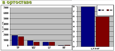 В ортостазе ТР значительно снижается у обоих полов, преимущественно за счет VLF и HF. У мужчин HF незначительно ниже, чем у женщин. LF/HF значительно увеличивается у обоих полов, но у мужчин в большей степени. У мужчин sd (ТР, VLF, LF, LF/HF) выше, а sd HF ниже.